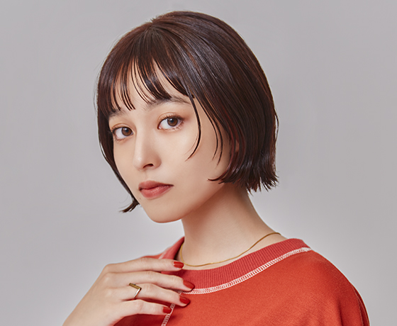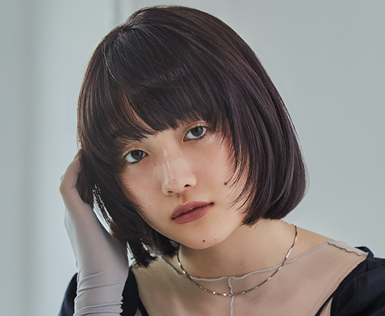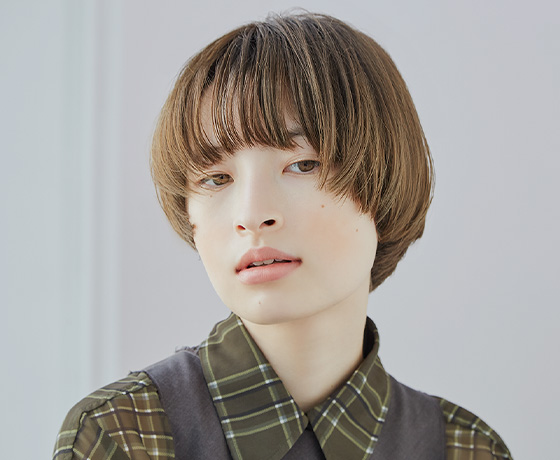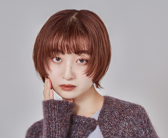 カラー経験のない髪を一度トーンアップさせ、モーヴ系ブラウンをON。グラデーションベースでやや前上がりにカットした重めのボブヘアには、カラーで柔らかさをサポートする。カットのポイントであるマッシュのような前髪の曲線と、顔まわりの独立した毛束が、透けるようなカラーによって束ごとの動きもより軽快に。
