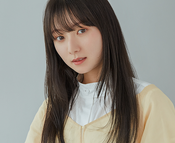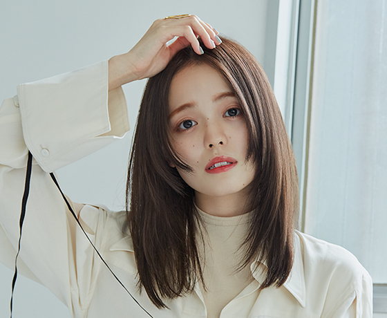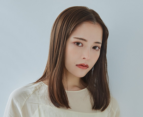アジア人特有の赤みやオレンジっぽさを削って、無彩色寄りのヌーディなブラウンに挑戦し、カラーの淡さだけでやわらかい 髪質を表現。その分、全体は重めのワンレンベース、顔まわりは角をとるだけのシンプルなカットに。