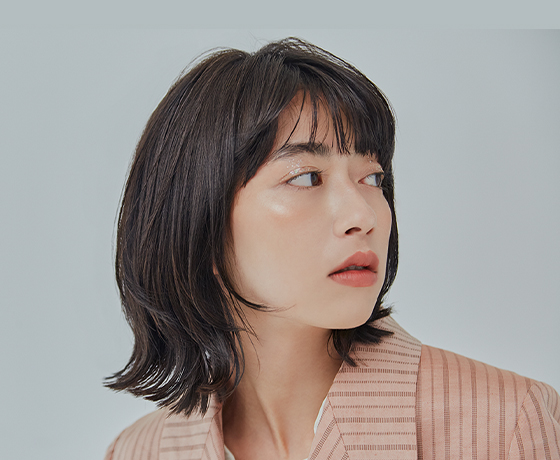赤みとアッシュの中間を狙ったまろやかなブラウンは、どんな肌色にも合わせやすいため、カラーに迷ったときにもおすすめ。カットベースはほぼワンレングスで、顔まわりはリップラインでプツッと独立させた毛束を作り、内巻きと外巻きのセットで変化を楽しむ2WAY仕様に。