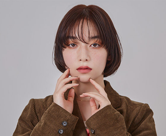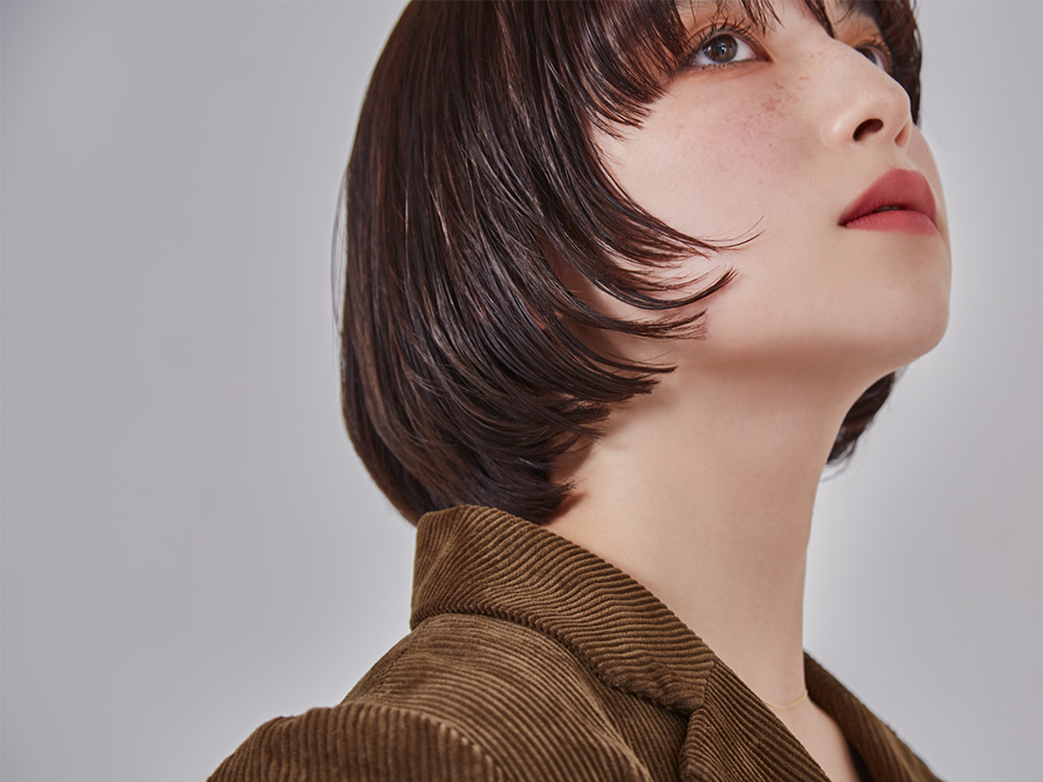 マッシュベースの前上がりボブを、温かみのあるブラウンに。赤みを削るカラーを試みると、髪質がマットな印象になりがちだが、ベージュを多く配合することでカバー。肌の血色も良く見えるため、くすみを気にせずダークトーンを楽しみたい人にもおすすめできるレシピだ。
