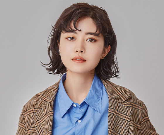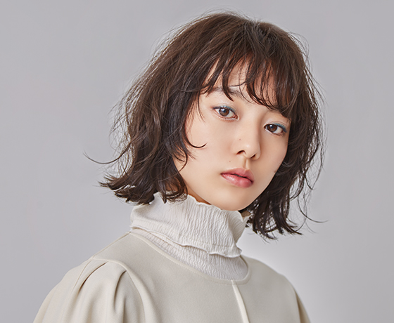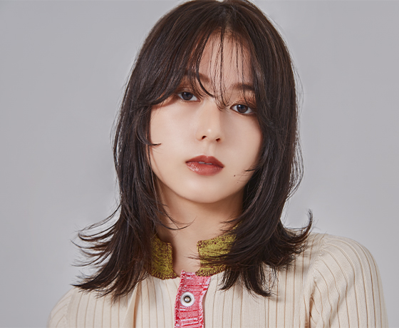サイドの髪を後ろに流し、バングはあえて目にかかるくらいの長さで、90年代のムードを意識。顔まわりはレイヤーを高く入れて、やりすぎないウルフカットに。カラーは、明るいシルバーグレーとアクアブルーをMIX。太陽光に当たると透けるような寒色のグレージュブラウンで、ウルフヘアを大人っぽく誘導している。