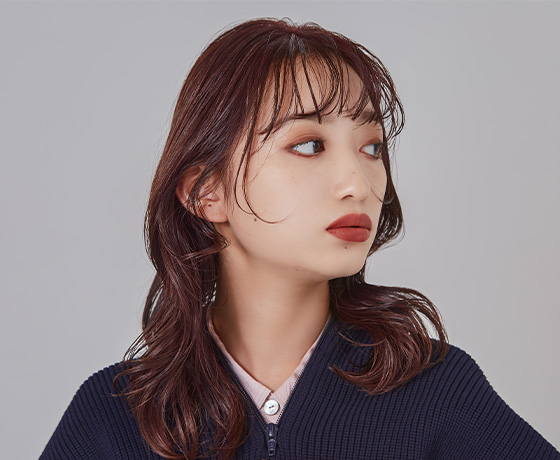目指したのはツヤ感のあるウェーブヘア。カラーでツヤを補うべく、高発色のチェリーピンクに、落ち着いたブラウンを加えたカラーをON。ブラウンで彩度を抑えることで、赤系カラーをやわらかく見せている。